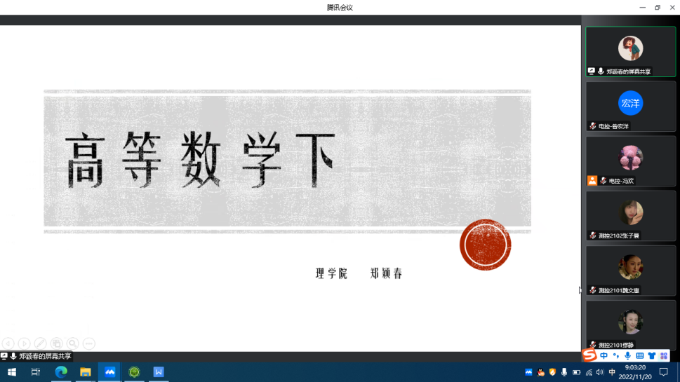 电控学院开展“聚焦学业帮扶,助力学生成长”系列活动,11月20日,针对《高等数学》需要帮扶的同学,学院邀请理学院郑颖春副教授开展线上辅导,以帮助学生掌握课程学习内容,达成课程目标。测控技术系主任昝宏洋,二年级辅导员王永、王新智老师、需帮扶同学等参会。