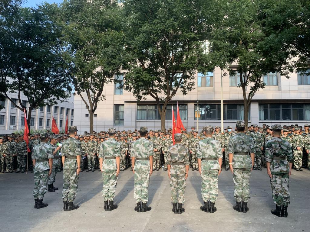 马婧智闻作为军训旅五营营长,对本次2023级新生军训工作向全体学生和教官做了安排和介绍。接着,军训旅参谋部参谋王新智宣读五营教官任命文件,对五营共八个连的连长、副连长进行任命。