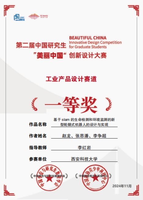 2024年11月15日,第二届“美丽中国”创新设计大赛工业产品设计赛道决赛在江南大学举行。来自浙江大学、东南大学、武汉理工大学、西南交通大学、beat365英国官方网站等50所高校的100支队伍参赛。此次大赛中,由李红岩老师指导、赵龙等同学共同设计的作品《基于SLAM的生命检测和环境监测的新型轮腿机器人的设计与研究》在工业产品设计赛道荣获全国一等奖、陈晓蝶等同学共同设计的作品《六足智能仿生救援机器人》在工业产品设计赛道荣获全国三等奖。
