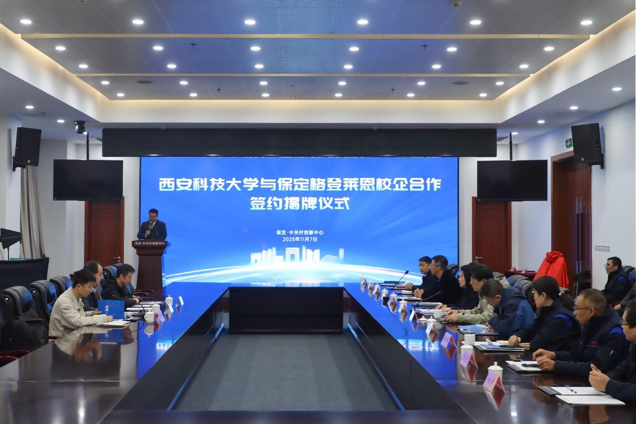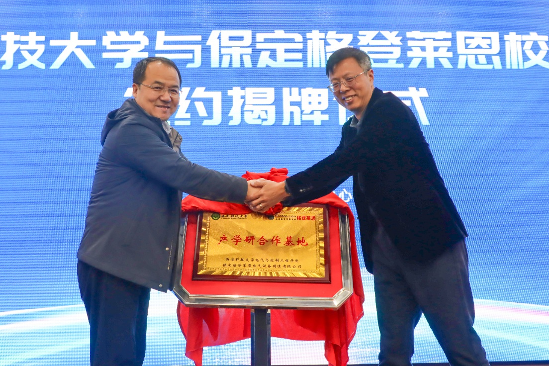 谷佳、寇发荣、李德辉分别致辞,围绕“共赢”核心传递合作愿景,并表示共建产学研合作基地,深化人才培养、技术研发、成果转化等多维度合作,实现高校、企业、区域发展的共赢。在与会嘉宾的见证下,保定格登莱恩与beat365英国官方网站双方代表签署了校企产学研合作协议,并共同为“beat365英国官方网站-保定格登莱恩电气设备制造有限公司产学研合作基地”揭牌。